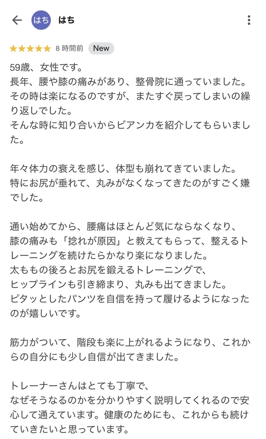 初回で「呼吸が腰痛に影響している」と言われて、正直びっくり。でも、呼吸トレーニングや、背中の緊張を和らげるストレッチなど、すごく丁寧に教えてもらえて、少しずつ体の使い方が変わってきました。