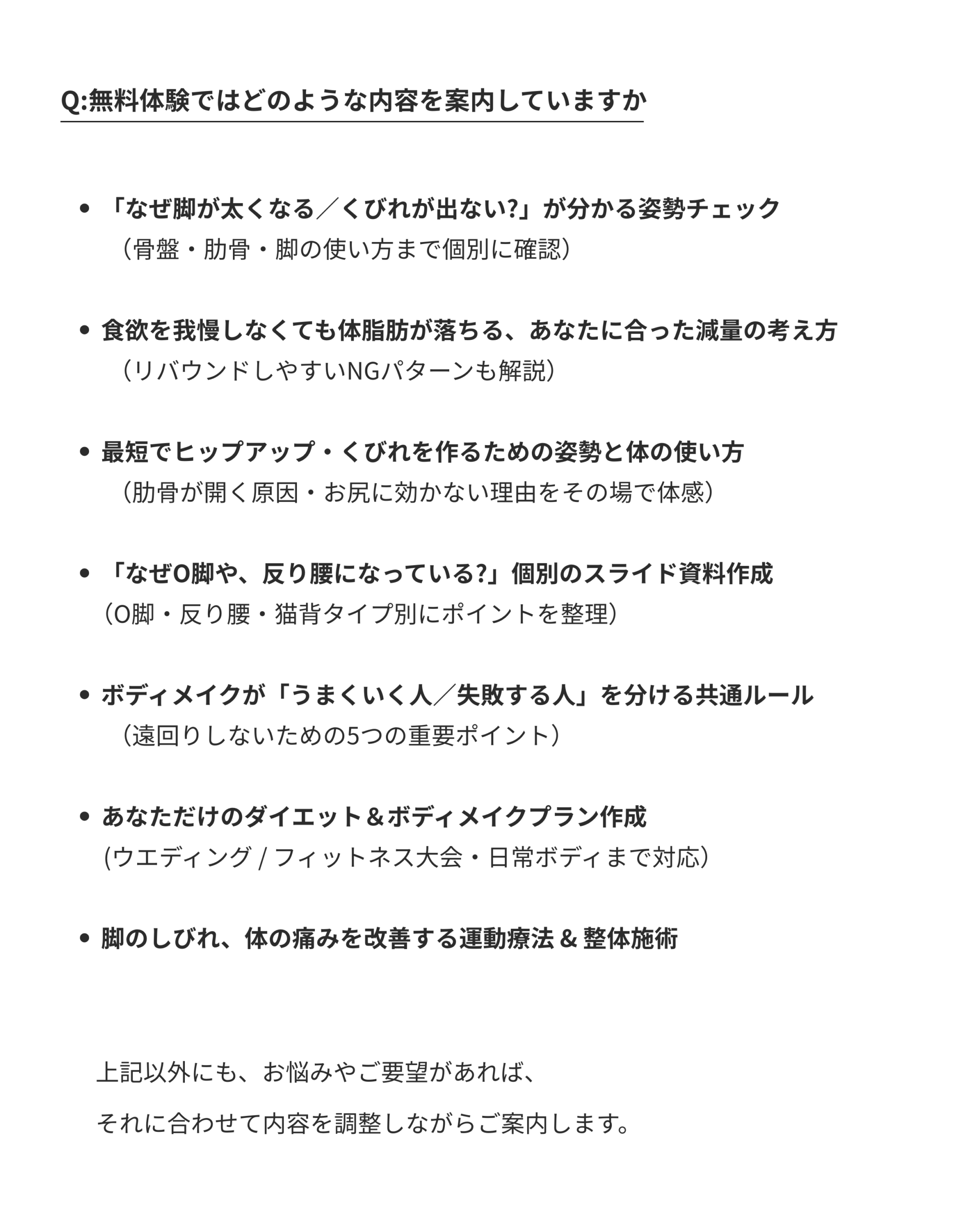フォームや筋肉の使い方など、細かく見ていただけるので、安心して身体づくりに集中できました。